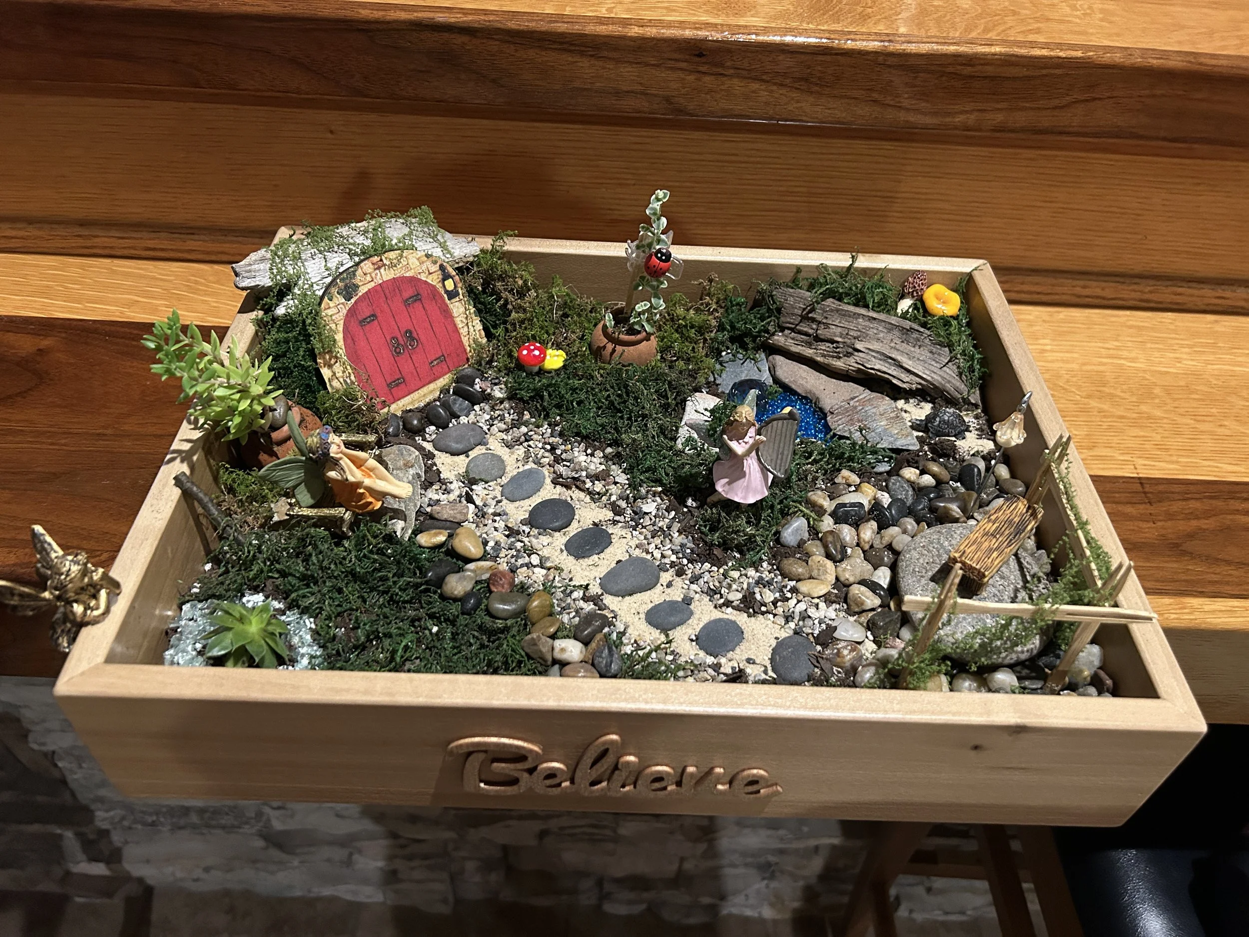 Join us to create a gorgeous Fairy Garden. Bev will guide you to create your own unique 16” X 12” garden. She will provide the planter and soil, 2 healthy succulents, and tons of unique embellishments. The solid wood box is handmade by her husband, Rick. Everyone’s box will have “Believe” on the front, as well as the peeking fairy perched on the side of the box. Sign up early, only 10 tickets are available!